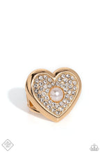 Pressed in a sleek, gold heart frame, brilliant white rhinestones encapsulate around a pearly center for a classic, heartfelt centerpiece atop the finger. Features a stretchy band for a flexible fit.