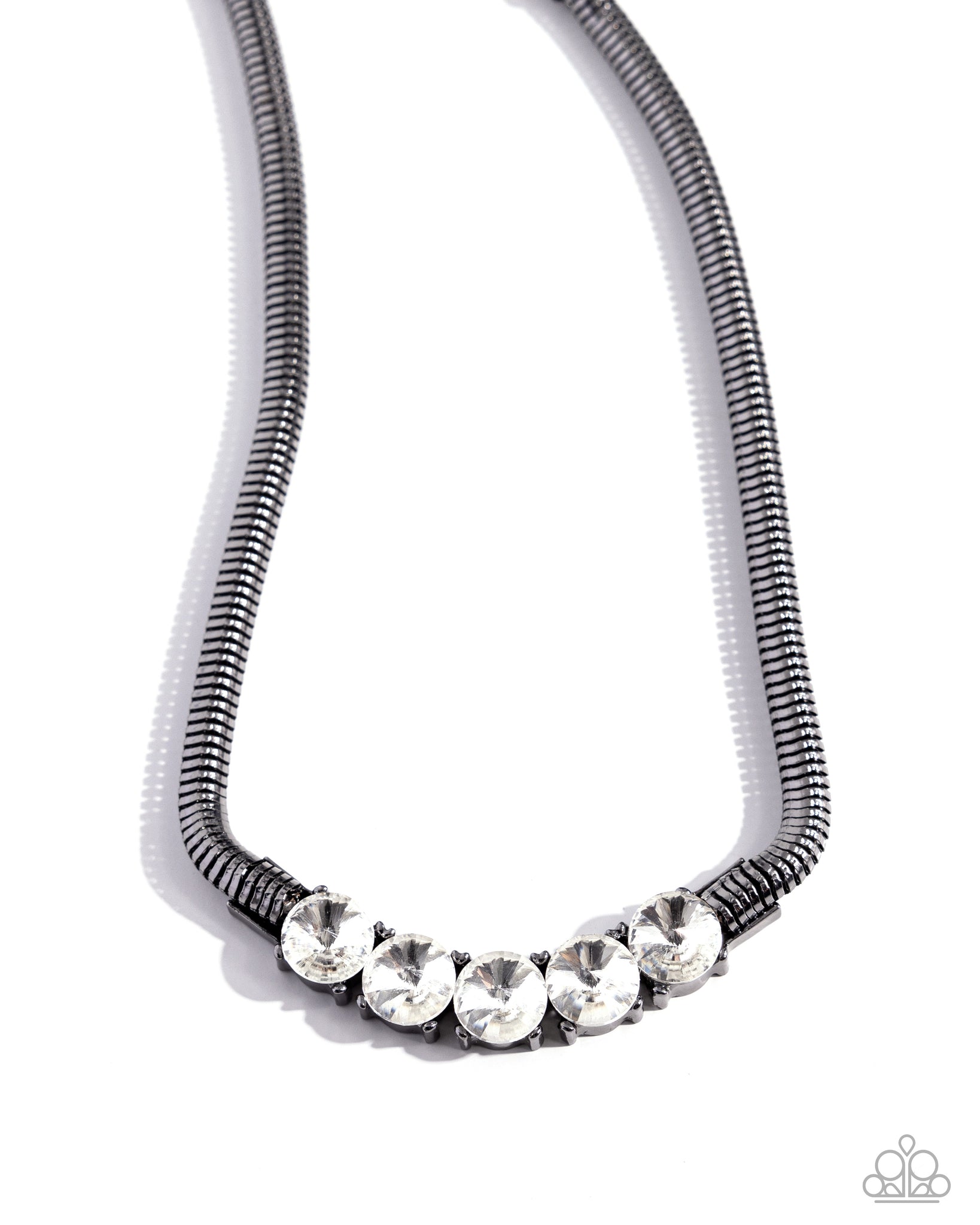 Pronged in place along the center of a thick gunmetal chain, faceted white gems twinkle below the neckline for a glittery, grungy look. Features an adjustable clasp closure.