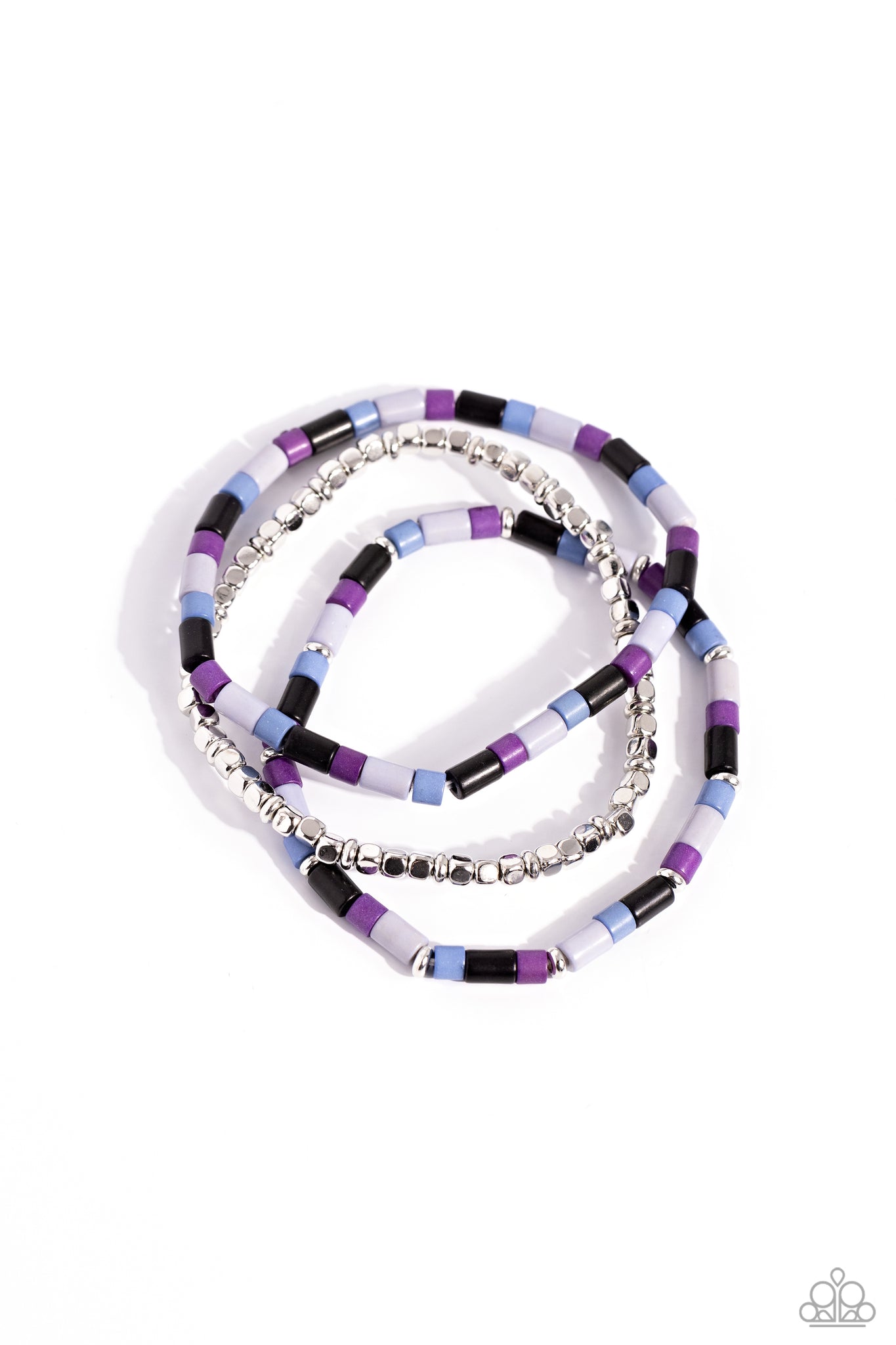 Black, purple, blue, and gray cylindrical stone beads, sporadically dotted with silver accents, combine with a strand of glistening silver cube beads along stretchy bands, creating all-natural layers around the wrist.