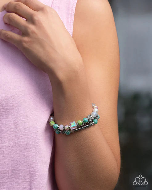 Infused along elastic stretchy bands, a collection of glistening silver beads, white pearls, multicolored beads in faceted shapes, iridescent-brushed glass beads, white rhinestone-dotted silver ornaments, and hand-painted rose and leafy beads with gold glitter accents coalesce and pattern around the wrist for a handcrafted, heirloom stack.