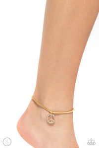 A gold peace sign infused with dazzling white rhinestones effortlessly slides along a thick gold snake chain, creating an irresistible pendant. Features an adjustable clasp closure.