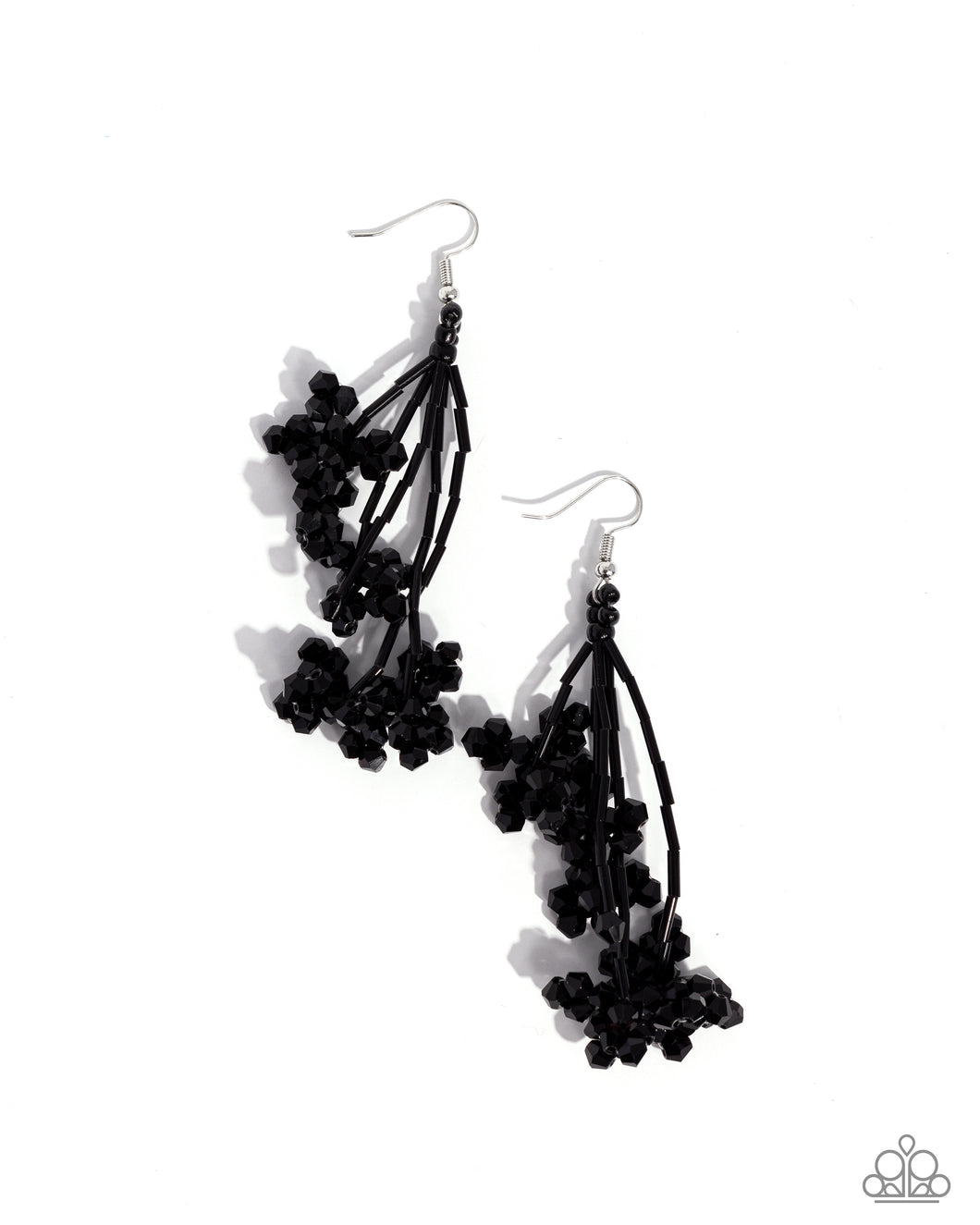 A sextet of black seed beads gives way to a collection of black cylindrical beaded strands that cascade from the ear. Featured at the ends of each cylindrical strand, faceted black beads bloom into a floral explosion for a fashionable fusion. Earring attaches to a standard fishhook fitting.