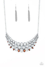 Gradually increasing in size at the center, a shiny collection of antiqued silver ovals join into bubbly plates that interlock below the collar. Dainty round and teardrop topaz rhinestones dot the bottom of the bowing display, adding dramatic hints of sparkle to the powerhouse piece. Features an adjustable clasp closure.