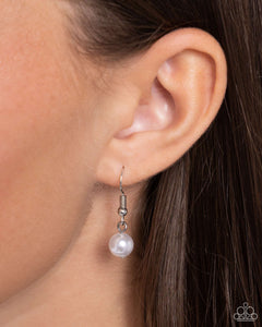 Three mismatched silver chains cascade in various lengths across the chest creating a radiantly edgy display. The uppermost chain is accented with glossy white pearls that sporadically interrupt the silver paperclip chain while a collection of dainty white baroque pearls glide along the lowermost beaded silver strand, creating a layered, glossy display. Features an adjustable clasp closure.
