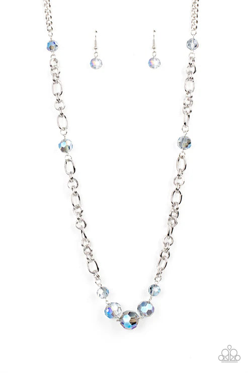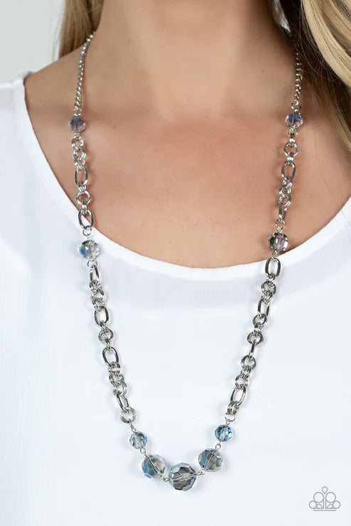 Flecked in oil spill iridescence, faceted crystal-like beads adorn sections of chunky silver chains across the chest for a gritty glamorous fashion. Features an adjustable clasp closure.