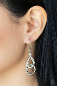 A glittery white rhinestone teardrop frame links with a shiny silver ring, creating a timeless lure. Earring attaches to a standard fishhook fitting.
