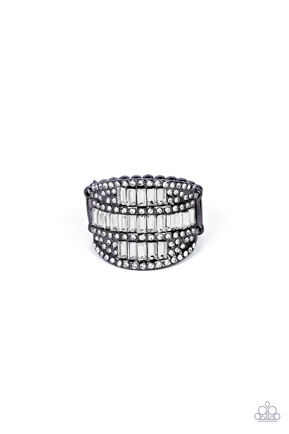The front of a gunmetal oval frame is encrusted in stacked rows of emerald and round cut white rhinestones, coalescing into a blinding centerpiece atop the finger. Features a stretchy band for a flexible fit.