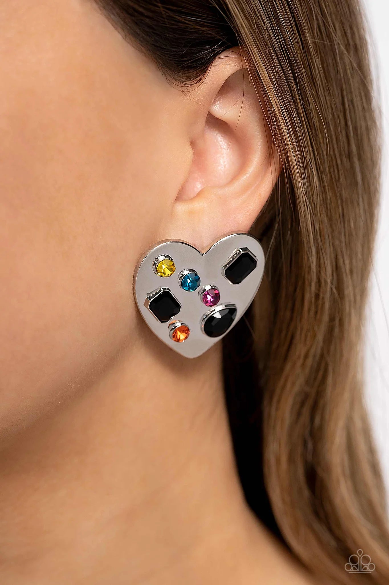 Brushed with shimmery pink, orange, yellow, blue, and black round, teardrop and emerald-cut gems, an oversized, high-sheen silver heart frame rests against the ear for a dazzling finish. Earring attaches to a standard post fitting.