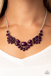 Teardrop plum beads fan out from the bottoms of solitaire white rhinestones as they link below the collar, creating whimsically stacked frames. Featuring an oval center, oversized teardrop beads flare out from the centermost frame for a flirtatiously floral finish. Features an adjustable clasp closure.