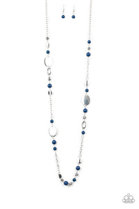 An array of polished blue beads, silver discs, and ornate silver accents trickles along a shimmery silver chain for a whimsical look. Features an adjustable clasp closure.