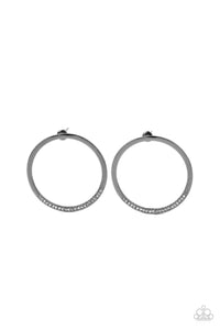 As if dipped in glitter, the bottom of a flat gunmetal hoop is encrusted in dainty white rhinestones for a classic shimmer. Earring attaches to a standard post fitting.
