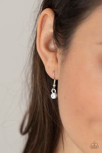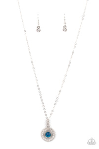 A white rhinestone encrusted fitting attaches to a ring of white rhinestones dotted with a glassy Blue Tint beaded center, creating a twinkly pendant at the bottom of a classic silver chain. Features an adjustable clasp closure.