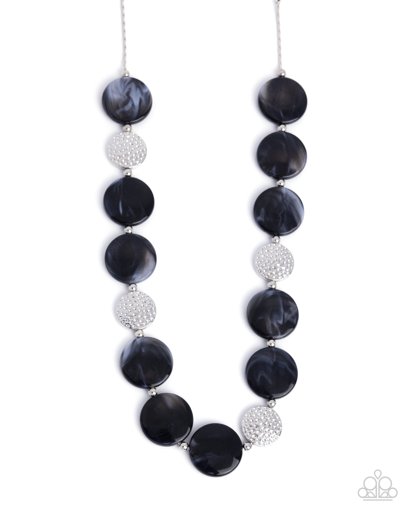 Infused along a thin-textured silver chain, a collection of hammered silver discs sporadically interrupts glossy, black-swirled discs in varying shades, alternating with dainty silver beads below the neckline for a pop of eye-catching color and texture. Features an adjustable clasp closure.