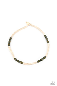 Tinted in the earthy shade of Military Olive, trios of wooden beads are strung along strands of white braided cording for a beach inspired look below the collar. Features a button loop closure.