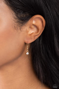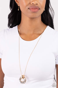 Featuring a white gem ring, a gold hoop is threaded through the center of a thick gold fitting. The dizzying pendant swings from the bottom of a lengthened gold snake chain for a dramatic, show-stopping look. Features an adjustable clasp closure.
