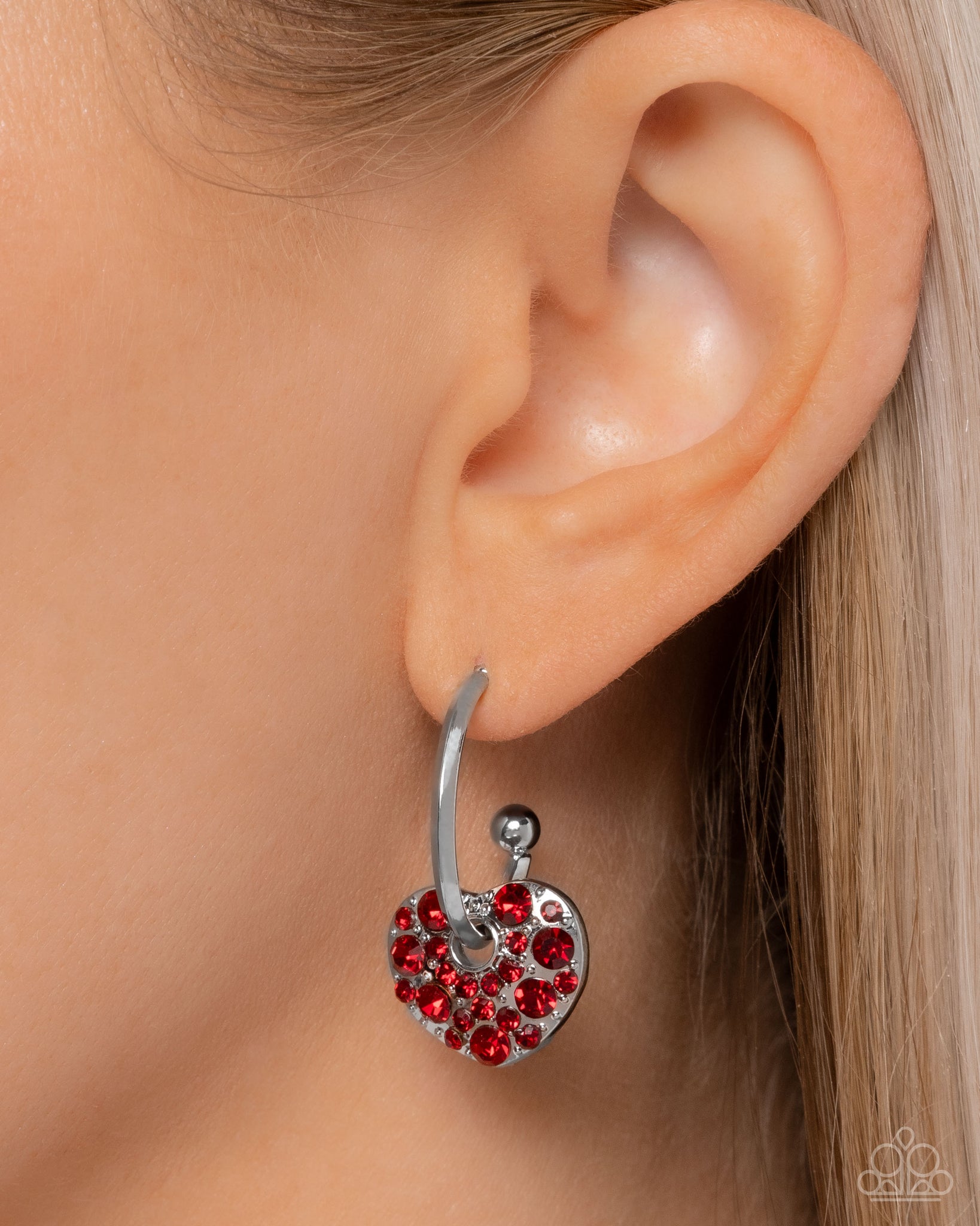 Infused along a sleek silver hoop, red rhinestones in varying sizes glitter and gather atop a silver heart pendant for a romantically radiant display along the ear. Earring attaches to a standard post fitting. Hoop measures approximately 7/8" in diameter.