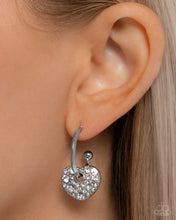 Infused along a sleek silver hoop, white rhinestones in varying sizes glitter and gather atop a silver heart pendant for a romantically radiant display along the ear. Earring attaches to a standard post fitting. Hoop measures approximately 7/8" in diameter.